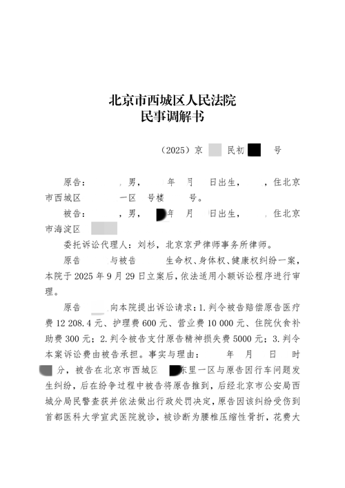 2025年5月某日晚,被告当事人在北京市西城区某街道与原告马某某因行车问题发生纠纷,后在纷争过程中被告将原告推到,后经北京市公安局西城分局民警查获并依法做出行政处罚决定,原告马某某因该纠纷受伤到首都医科大学宣武医院就诊,被诊断为腰椎压缩性骨折,花费大量医疗费用。