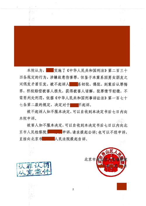 2021年4月某日晚,在北京市房山区某门口附近,因生活琐事,当事人(被不起诉人)与被害人(双方系情侣关系)发生口角。情绪激动之下,当事人动手击打被害人一耳光,随后双方发生互殴,致使被害人左胸壁软组织损伤,左侧第2、3、4前肋骨折。经司法鉴定,被害人所受损伤程度构成轻伤二级。案发后,被害人报警,当事人当场向被害人支付1000元。