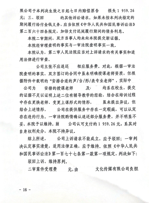 传媒公司主张不应退还陈某相应服务费。对此,根据一审法院查明的事实,双方签订的合同中虽未明确授课老师资质,但根据附件中载明的“安排合适的声/台/形/表专业老师”,实际中传媒公司为陈某安排的授课老师郝某及杨某均系在校生,提交的证据不足以证明上述二位有辅导教学的经验,结合在培训过程中存在更换老师、变更上课形式的情形,陈某虽未提出异议,但结合上述情形,传媒公司在提供服务中存在一定瑕疵,可以认定存在违约行为。一审法院酌情确认退还部分服务费,并不明显不妥,二审法院予以维持。就传媒公司认可支付的1959.26元,系其对自身权利处分,法院不持异议。