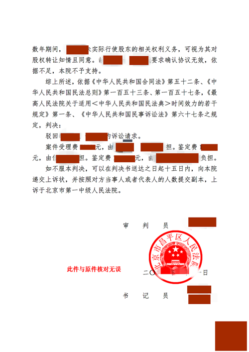 再次,另一原告任某斌虽申请鉴定,确认《股权转让协议》上签字非本人签字,以证明该协议并非其真实意思表示,但在该协议签订后,郝某1即办理股权变更登记,任某斌作为股东随时可查看工商信息,但其未提出异议,且在此后数年期间,任某斌未实际行使股东的相关权利义务,可视为其对股权转让知情且同意。