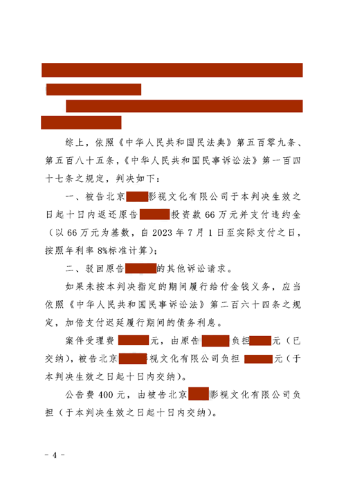 1、被告北京某影视文化有限公司于本判决生效之日起十日内返还原告弥某投资款66万元并支付违约金(以66万元为基数,自2023年7月1日至实际支付之日,按照年利率8%标准计算);