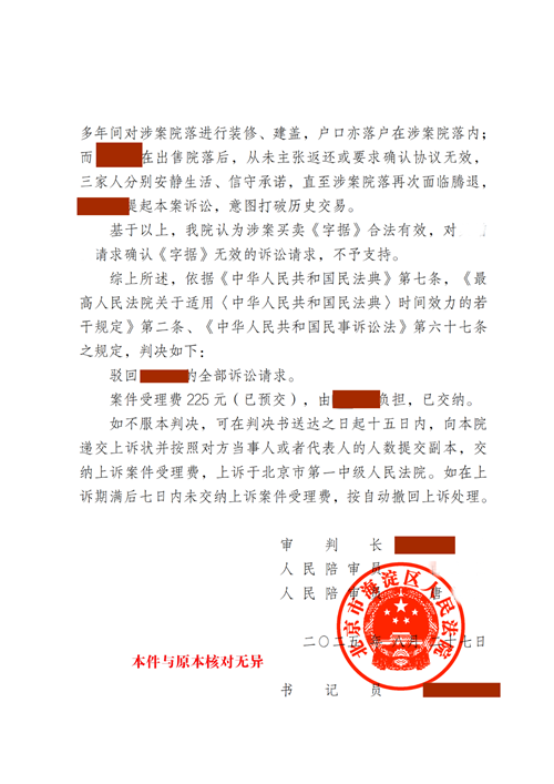 本案一审中,曲大富律师、查嫣媛律师在庭审中指出:合同系当事人真实意思表示,已于1987年履行完毕,买受人实际居住38年,卖方现主张无效违背诚信原则;合同订立时未违反当时法律,应适用法不溯及既往原则认定有效;交易经集体同意,买受人户口已迁入并形成稳定占有;原出售方早在1987年已因征地享受安置并转为非农户口,退出集体经济组织;买受人购房后已对房屋重建翻建,卖方起诉意在获取腾退利益,有违诚信。