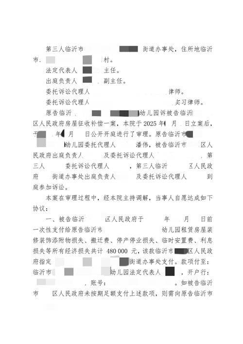 时间来到了2024年5月,临沂市中级人民法院作出行政判决,判决被告临沂市某区人民政府于判决生效后一个月内补偿原告幼儿园装饰装修固定资产等损失人民币 403002.44 元,同时也驳回原告幼儿园的其他诉讼请求。
