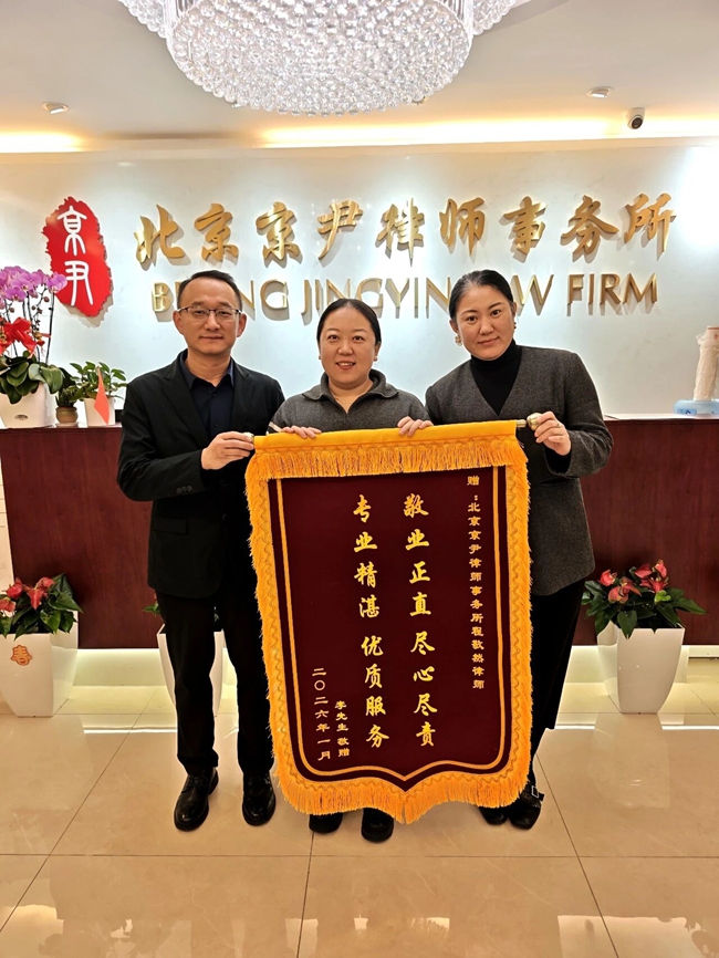 1月27日,北京京尹律师事务所程敬然律师收到了一份特殊的礼物——一面由当事人专程寄来的鲜红锦旗。锦旗之上,“敬业正直 尽心尽责;专业精湛 优质服务”十六个鎏金大字格外醒目。这熠熠生辉的文字,不仅是对程律师卓越专业能力的高度赞誉,更承载着委托人那份真挚而深沉的信任与感激。